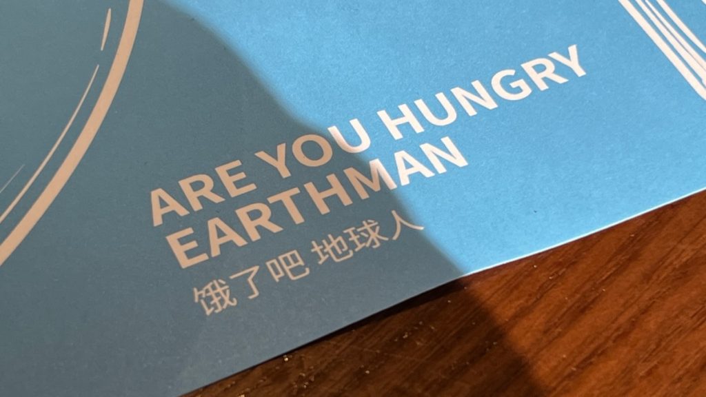 “Are you hungry Earthman”. Well, I’m sure there is a proper, more established way to refer to people and other, well, organism living on Planet Earth — Earthling seems to be more scientifically correct (and also more gender-inclusive). This being a space-themed restaurant, though, I’m sure the more vanilla “person” probably won’t quite cut it.
