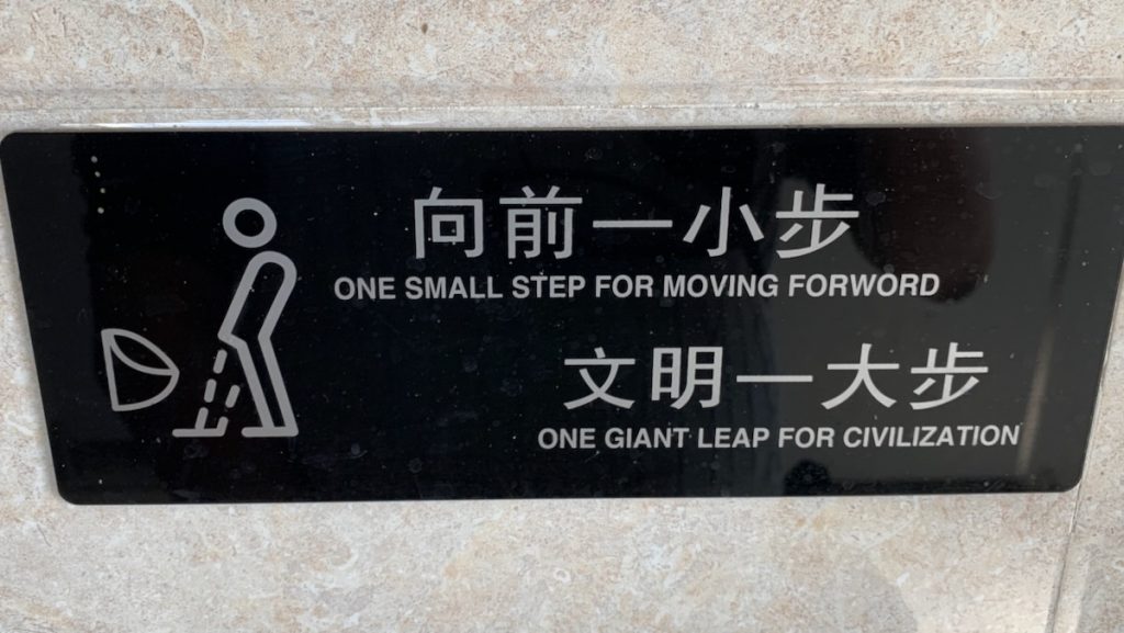 “One small step for moving forword, one giant leap for civilization”. That’s if Neil Armstrong was ever put in charge of Chinglish-inspired signage for the millions and billions and trillions of urinals across China. It’s a poetic — but still pretty weird — way to tell me, well, “take aim!” when using the urinal!