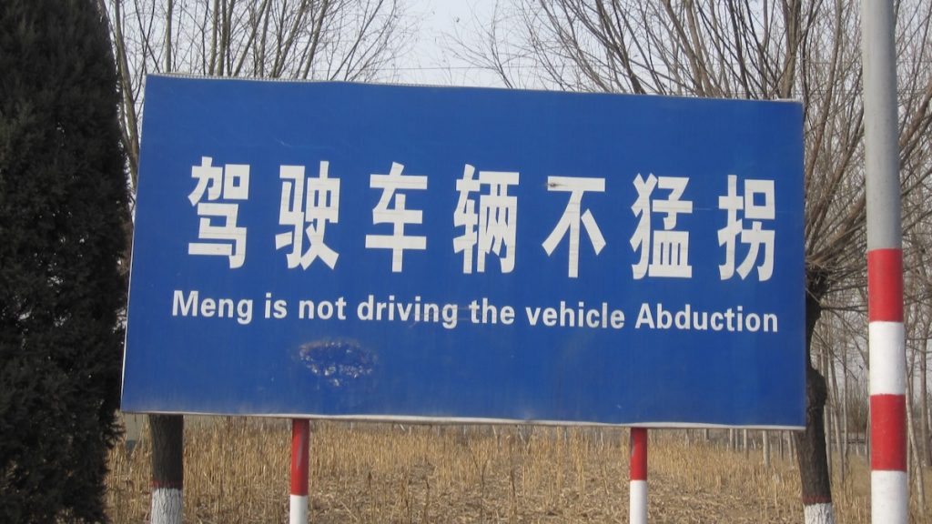 “Meng is not driving the vehicle Abduction”. This epic classic from Hebei Highways about 15 years ago is a darling on flickr Chinglish from yours truly — and makes pretty much no sense at all (yet sends people exploding into peels of laughter all the time). It is because it makes no sense — a nonsensical mix of Pinyin, very poor translations, and capitalisation issues — that makes it a classic. And all they wanted to say was — if you’re driving, don’t swerve — like out of the blue…