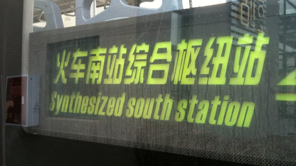 “Synthesized south station”. Hey, bring out the microphones, drum sets and synthesisers out — we’re making a Chinglish Anthem! Alternatively, this could be made to read that this place seems highly artificial (well, buildings always were artificial things). But for a multimodal transport hub, this indeed does appear head-scratching…