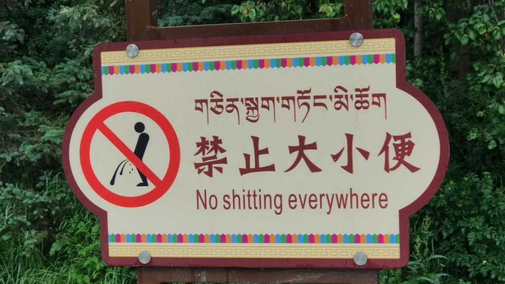 “No shitting everywhere” in Qinghai. Yes, it indeed is sometimes very surreal to see four-letter words used uncensored in public. The Chinese text also bans what some would call “pissing” (or urination, if we’re to use more genteel words). The sign, of course, has great impact, looking “great” on television, but I’m sure we could use a better sign.