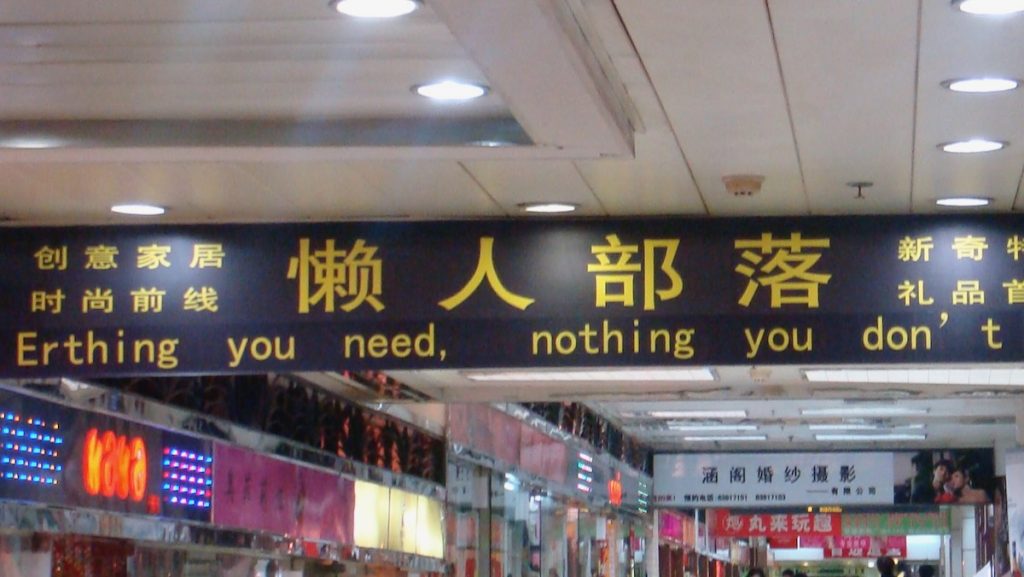 “Erthing you need, nothing you don’t”. Nice and simple, this shop, found in the underground shopping complex right by People’s Square Metro station in Shanghai, seems to promise you the real deal — of course, in Chinglish. But it’s almost like “Erthing” seem to make some kind of sense, really.